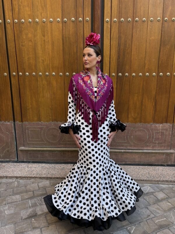 Affordable flamenco dress made of white crepe with black polka dots. A spectacular, lightweight dress with plenty of movement, a timeless classic perfect for any fair or pilgrimage.