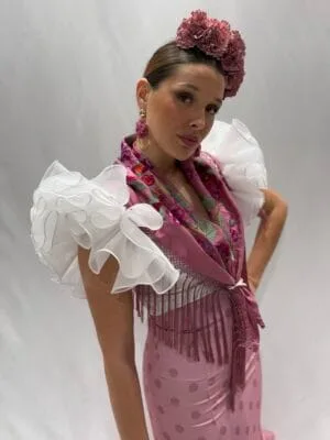 Fitted body and straight waist. Skirt composed of a large cape ruffle and three smaller cape ruffles; off-white chiffon floats adorning the ruffles and double off-white organdy layer ruffles. Long sheer lace sleeves finished with a small cape ruffle. Embroidered flower appliqués on the waist, waist and sleeves. Eye-catching and elegant design, ideal for both brides and flamenco dancers who want to show off this dress at the fair.