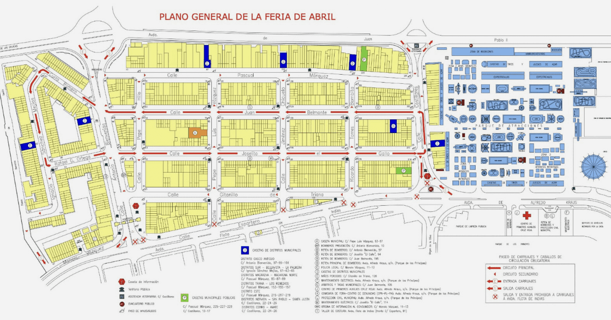レアル・デ・ラ・フェリアの通りは、見本市会場のメインストリートであるインフィエルノ通りと直交するように敷設されています。正面入口ゲートから、見本市会場の様々なブロック(合計25)が、それぞれ通りと広場で区切られています。