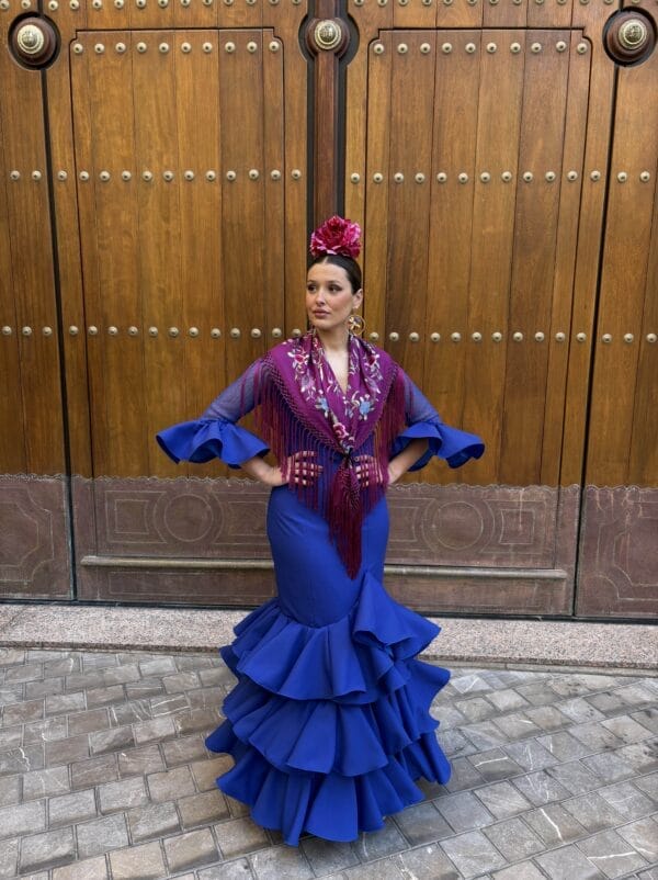 ライトブルーのストレッチ素材を使用した、お手頃価格のコレクションから登場したフラメンコドレス。その色彩とスタイルが魅力の、格調高いジプシードレス。目を惹くデザインに加え、何よりも着心地の良さが魅力。フェアや巡礼に最適です。*このモデルはViva la Feria限定です。
