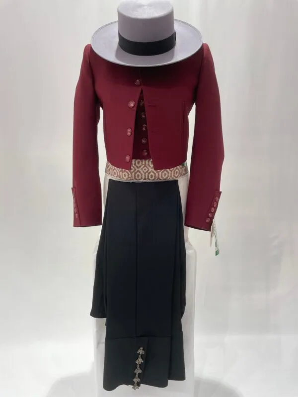 Este conjunto incluye una chaqueta y chaquetilla en un distinguido color burdeos, acompañado de unas calzonas en color negro, ofreciendo una combinación clásica acorde con la tradición de la doma vaquera.