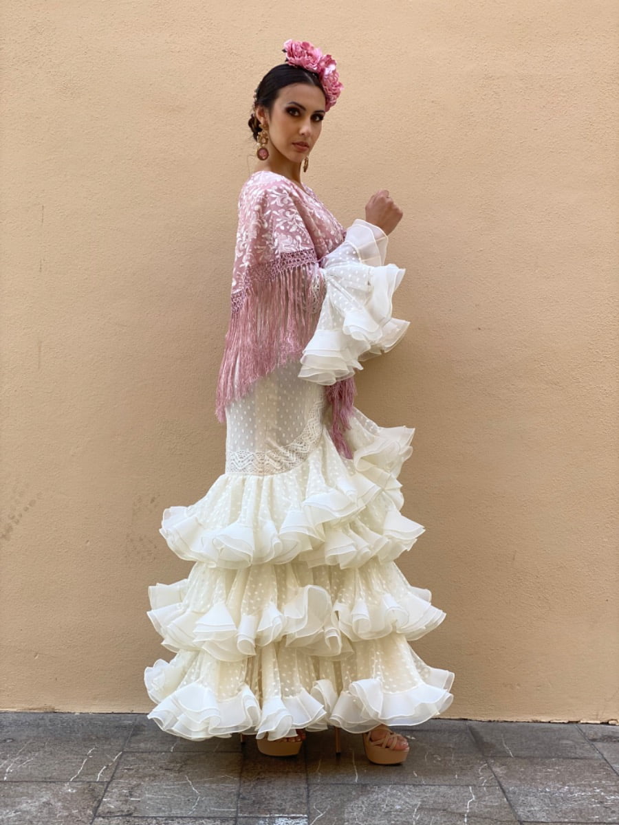 Este exclusivo traje de flamenca modelo Corin pertenece a la colección Guadalupe Moda Flamenca. Es un traje de flamenca confeccionado en tejido tul de plumeti, y carece de forro en las mangas para generar transparencias.