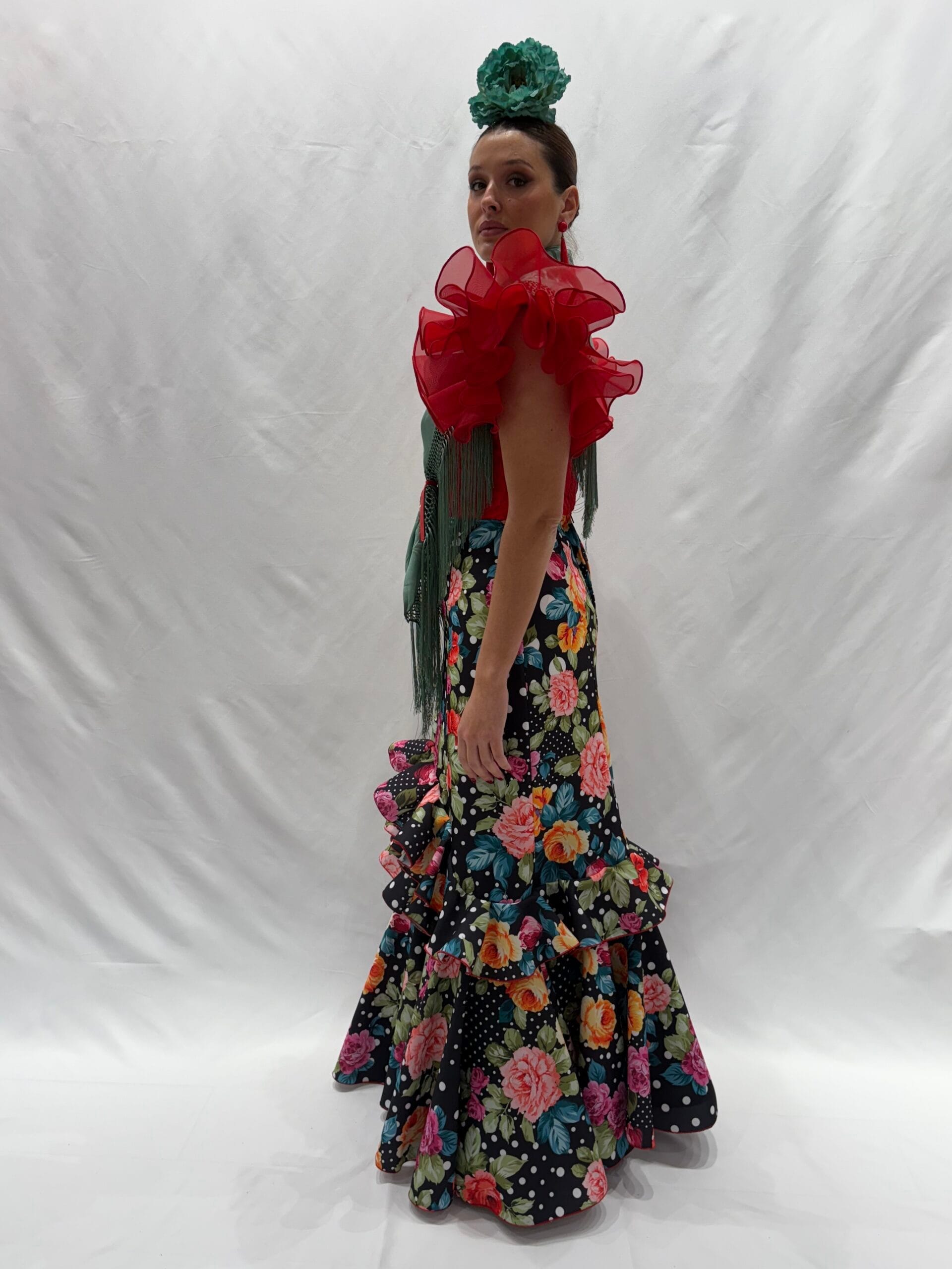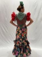 Falda flamenca confeccionada en tejido popelín estampado con flores negras, combinada. Entallada hasta la cadera y con corte evasé, talle de pico. Falda flamenca estampada con un volante grande de capa, sobresale organdí negro. Pañoleta no incluida en el precio. Clásica pero con una “hechura” novedosa.