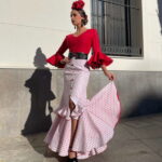Falda ideal para el Rocio confeccionada en tejido de strech de color blanco y lunares rojos, entallada hasta la cadera desde donde abre el corte. Ideal para combinarla con la blusa flamenca modelo Feria.