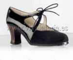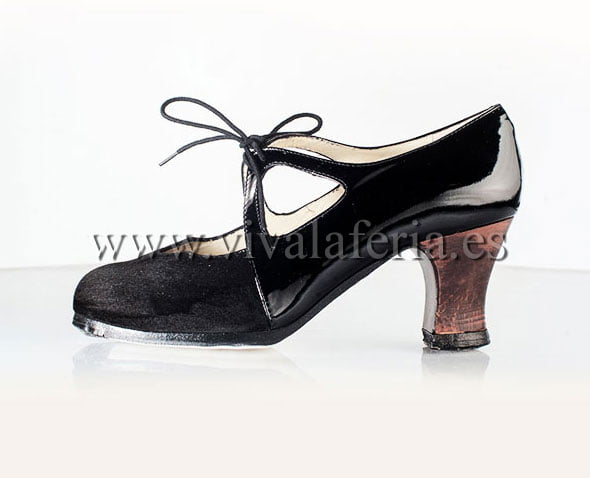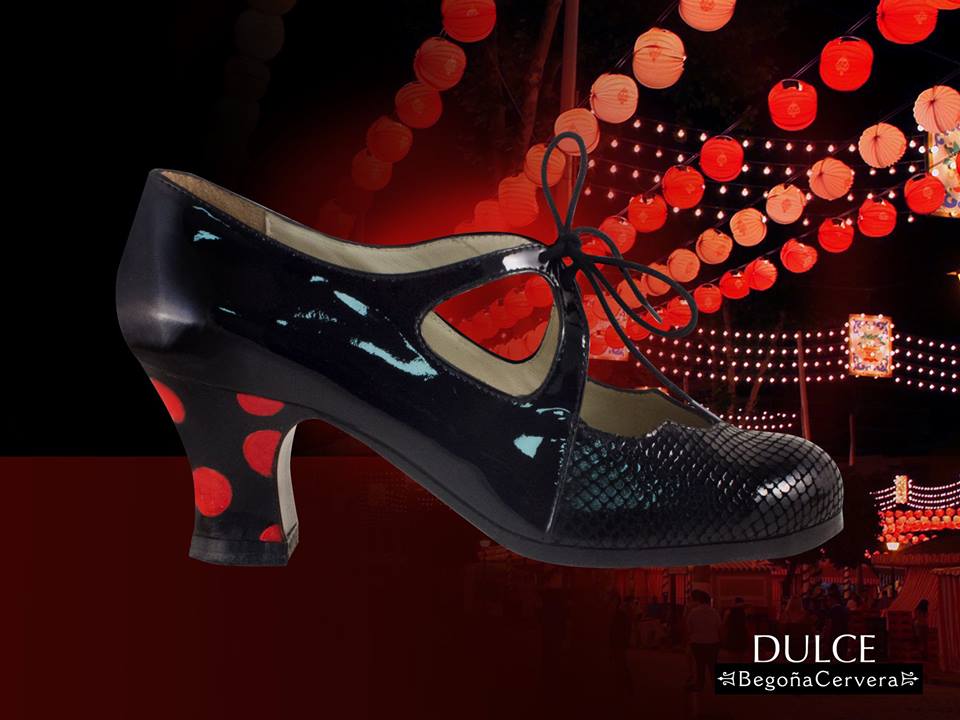 El modelo Dulce de Begoña Cervera es una perfecta elección a la hora de decantarse por un zapato de baile flamenco para esta temporada de 2016. De riguroso negro pero con dos tipos de materiales, está elaborado con planta de cuero, suela cosida a mano, filos con acabado antideslizante, clavos en puntera y tacón, forro de piel.