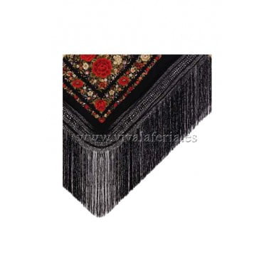Mantón de manila seda natural bordado rosas soja y fondo negro con flecos