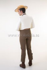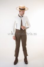 Una de las novedades de la colección de trajes camperos son los trajes combinados. El tejido elástico combinando el color hueso con los remates en marrón en chaqueta y chaleco hacen de este traje, una magnífica combinación campera para cualquier evento. Si te gustan los colores claros, este es tu traje de corto. Incluye chaqueta, chaleco y calzona. Ya sea en la romería, en un tablao flamenco o en el real de la feria, con tu traje campero de hombre irás impecable.