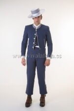 Una de las novedades de la colección de trajes camperos son los trajes combinados. El tejido elástico combinando el color azul con los remates en azafata en chaqueta y chaleco hacen de este traje, una magnífica combinación campera para cualquier evento. Incluye chaqueta, chaleco y calzona. La calzona podemos servirla en azul o en color gris plata. Ya sea en la romería, en un tablao flamenco o en el real de la feria, con tu traje campero de hombre irás impecable.