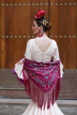 Este vestido de flamenca confeccionado en tejido bielástico, lleva el escote delantero fruncido debajo del pecho y espalda de pico, consúltanos si prefieres otra forma del escote.
