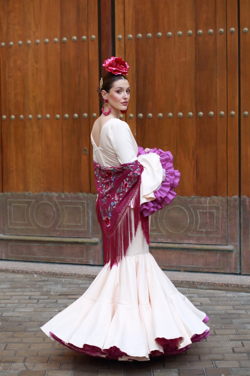 Este traje de flamenca 2024 lleva el cuerpo entallado, talle bajo y recto desde donde salen dos volantes grandes de capa unidos entre sí, enaguas