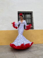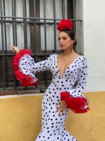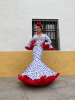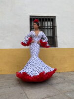 Traje de gitana confeccionado en tejido de crepe en color blanco con los lunares pequeños en negro (no elástico), disponible en otras combinaciones de colores.
