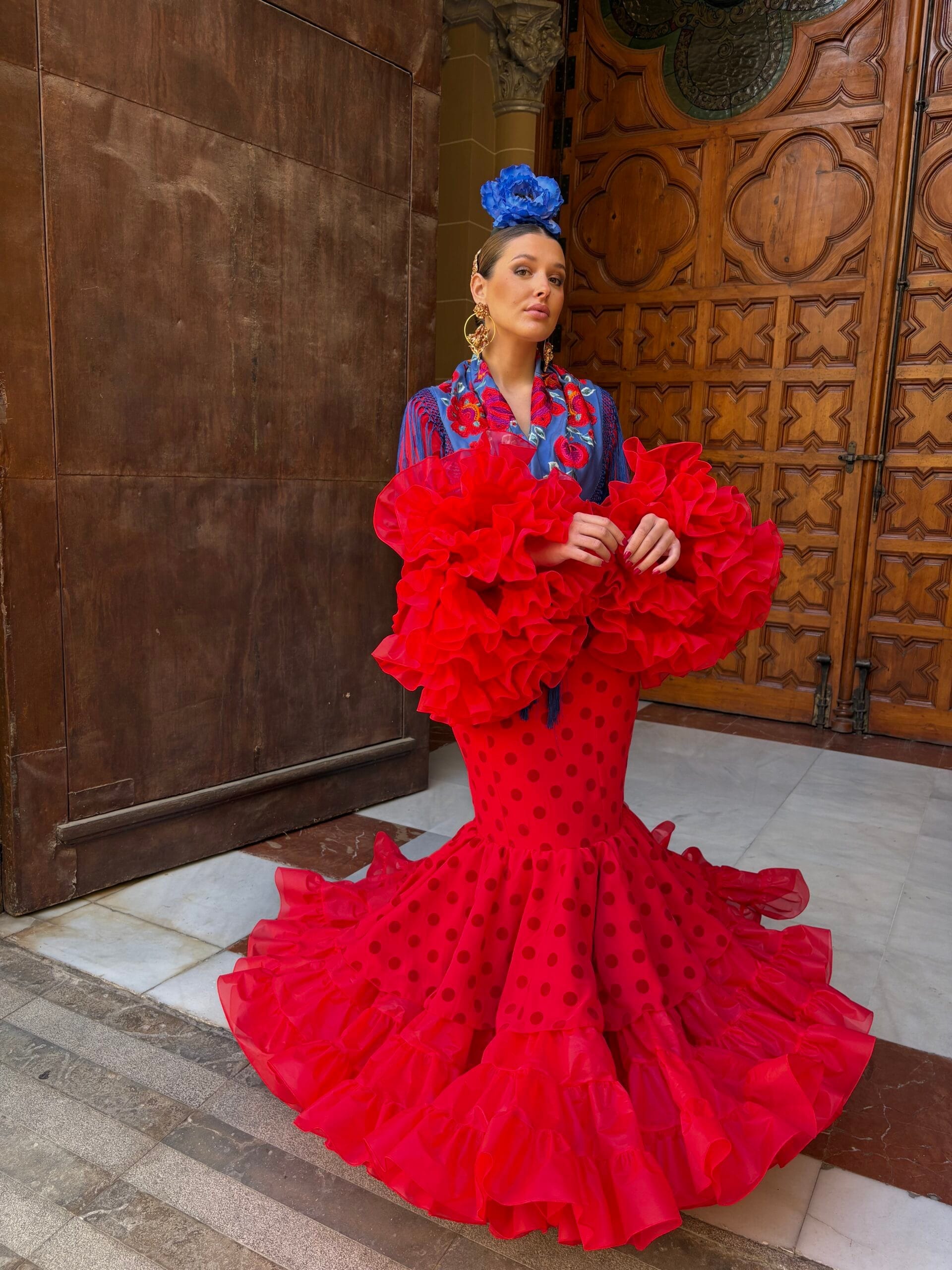 Vestido de flamenca de gran volumen en gasa flocada. Disponible en rojo y negro.