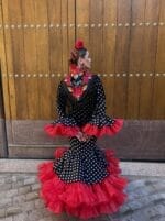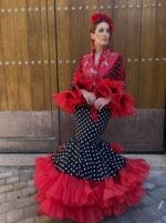 Exclusivo diseño que destaca por su elegante combinación de tejido koshivo negro con lunares blancos. El cuerpo entallado y la falda canastera con doble cancán crean un conjunto de gran presencia y movimiento perfecto para ferias y romerías.