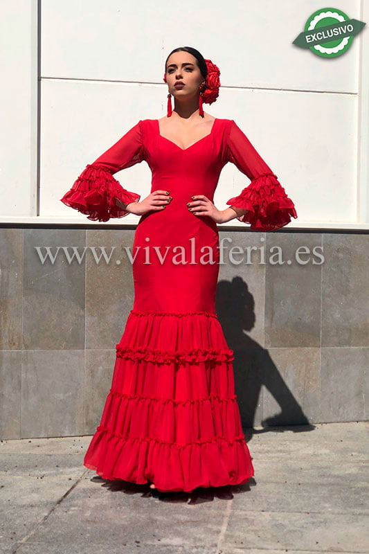 Vestido de flamenca confeccionado en strech color rojo. Escote delantero de corazón muy favorecedor y espalda normal. Cuerpo entallado y talle recto. Falda canastera de cuatro volantes del mismo tamaño, en la unión del primer volante con el segundo una carrucha adornando la falda. Mangas al codo con tres volantes canasteros.