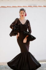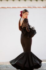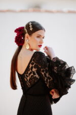 Escote delantero de pico y escote trasero pronunciado, con transparencias que dejan ver un segundo escote en «palabra de honor´´. Entre la zona del pecho y la cintura se aprecia el tejido de encaje forrado en color negro y a partir de ahí ya aparece el tejido flocado. Talle bajo y recto con falda flamenca de un volante grande de capa, las enaguas confeccionadas en tejido de cancán el color negro. Mangas largas y de encaje transparente con tres volantes haciendo juego con el resto del vestido.