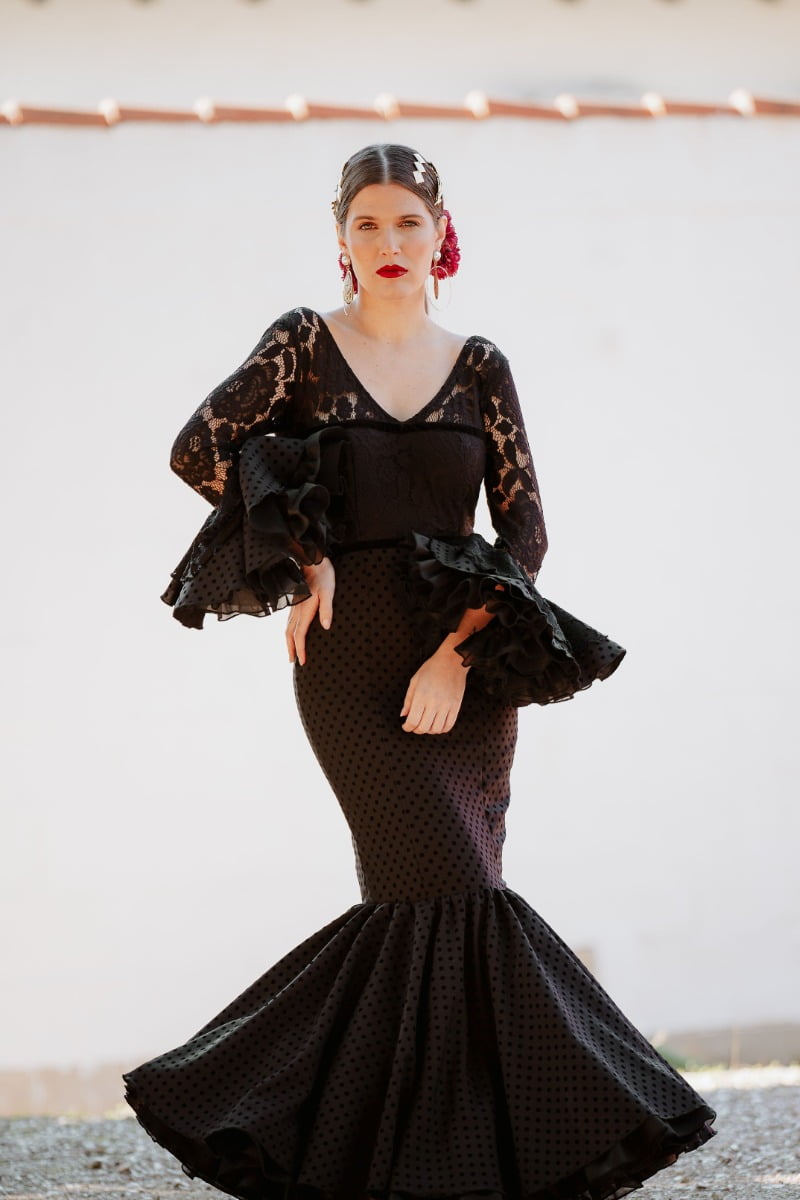 Traje de flamenca confeccionado en tejido de encaje negro combinado con tejido flocado de lunares negros.