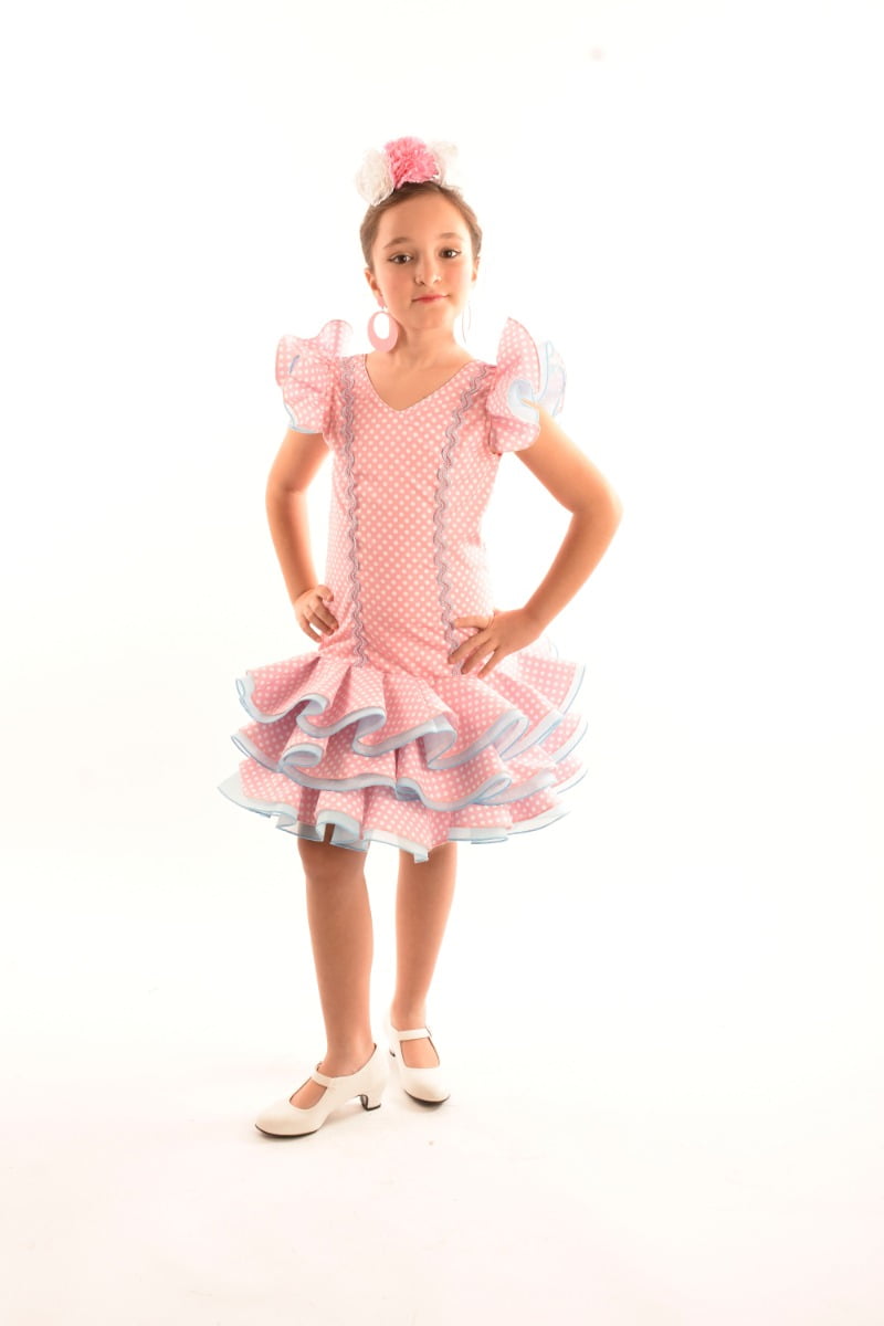 Vestido de flamenca corto de niña confeccionado en popelín de color rosa bebé y lunar blanco combinado con cancán celeste. Escote delantero y trasero de pico. Cuerpo adornado con encaje de bolillo camel y talle recto a la cadera (alta). Falda de tres volantes dobles de capa de popelín y de cancán. Manga a la sisa adornada por un volantito doble al igual que la falda.